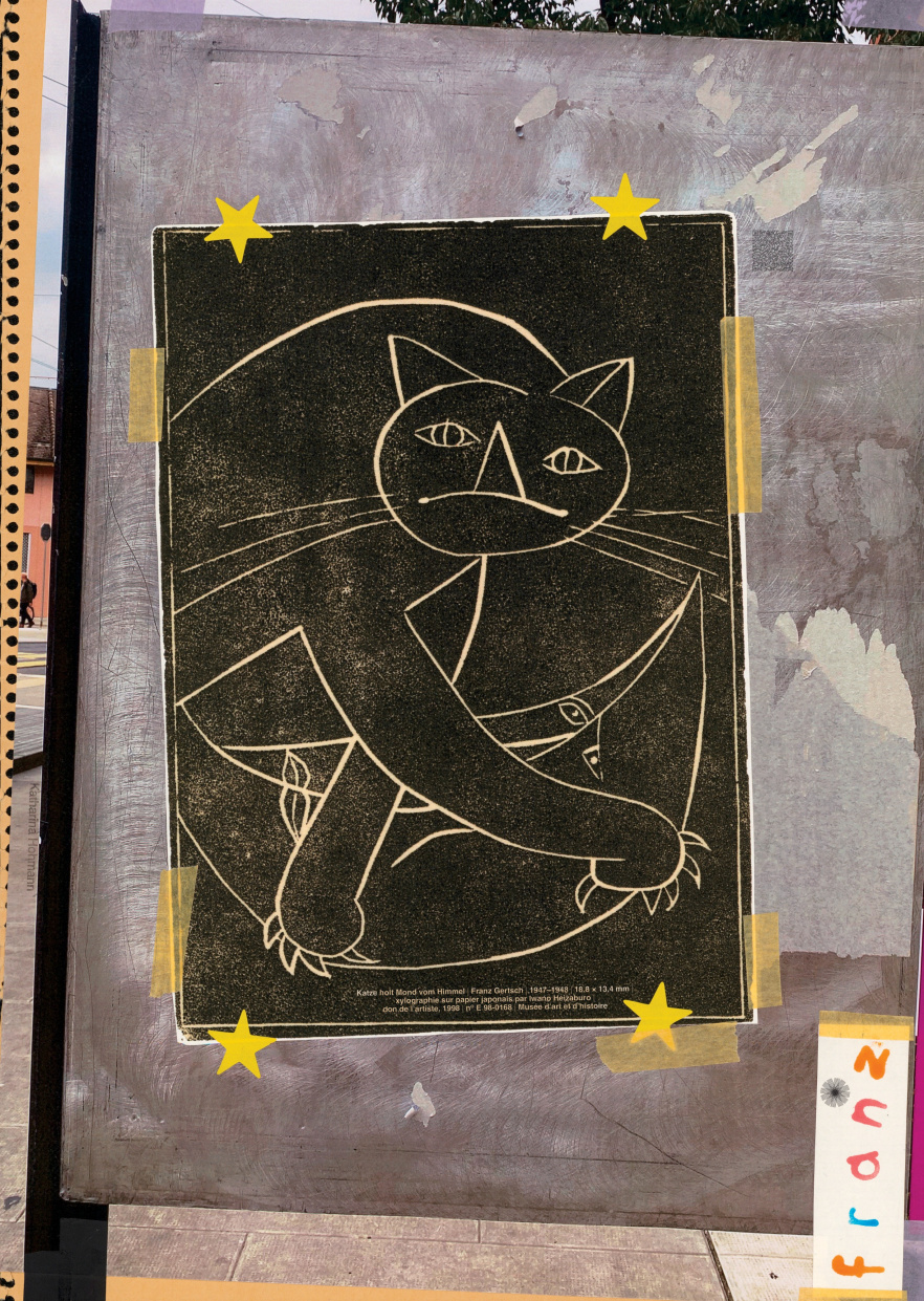 In a three-part project, Katharina Hohmann examines, researches and appropriates the cats from the collections of the Musée d'art et d'histoire (MAH) in Geneva: the result is a series of posters, a cat flap installed in the museum portal and a publication to conclude the project. In early 2026, the animals will become the protagonists of collages distributed throughout the city, reminiscent of the aesthetics of “lost cat” posters. The cat artefacts, pictures and drawings (most of which lie dormant in the museum's depots) reveal their strangeness and their historical and contemporary significance in their diversity. At the same time, a cat flap in the entrance portal of the MAH – somewhere between trompe-l'œil and ready-made – evokes the permeability of the museum collection and underlines the fragility of the museum as an institution. Finally, a publication will round off the project, continue this investigation and conjure up the spirits of the MAH cats.
