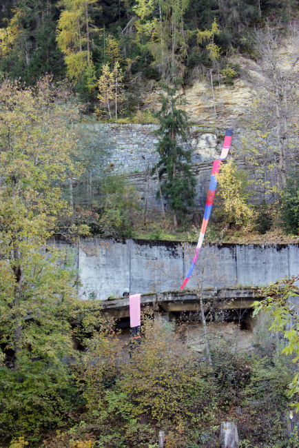 Die Eingriffe sind temporär, die Aneignung findet nur für eine kurze Dauer statt um als Bild unter Bildern zu einem Archiv zu werden, einer Art subjektiven Kartografie des Landschaftsraumes und der Architektur darin, Zeichen menschlicher Inbesitznahme. Wir reisen mit 10 grossen Stoffbahnen in den Farben rot, blau, weiss, rosa, orange schwarz und violetten ins Engadin. Im Gepäck haben wir eine Nähmaschine, Faden und Stickgarn, Nadel und Schere. Im losen Farbwechsel nähen wir Streifen von je 250 cm Länge und 70 cm Breite aneinander. Es entsteht ein über fünfzig Meter langer sequenzierter Farbstreifen. Unser Engadiner Maß.