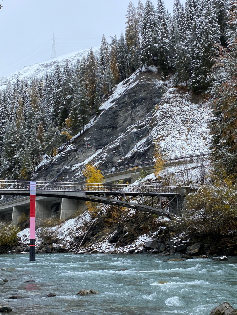 The Engadine Measure is an oversized tape measure, a tool, an object of study with which we approach, describe, name, understand, map, photograph and archive the environment from the specific context of Nairs. The tape is the measuring stick of the subjective, our way of actively placing ourselves in relation to our immediate surroundings. The interventions are temporary, the appropriation only takes place for a short period of time in order to become an archive as an image among images, a kind of subjective cartography of the landscape and the architecture within it, signs of human occupation. We travel to the Engadine with 10 large fabric panels in red, blue, white, pink, orange, black and purple. In our luggage we have a sewing machine, thread and embroidery thread, needle and scissors. In a loose change of colors we sew strips of 250 cm length and 70 cm width together. The result is a sequenced strip of color over fifty meters long. Our Engadine Measure.
