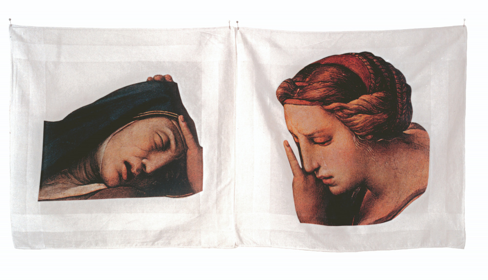 From sacred paintings, e.g. from the Renaissance, I copied portraits of crying people, applied them to handkerchiefs and sewed them onto a huge canvas. With every breeze of the trains coming in and going out, the handkerchiefs waved to the travelers. After a year the handkerchiefs had a black patina, half of them were missing, torn off by travelers.