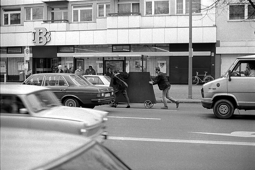 A mobile trapeze made of steel, a sculpture on wheels made of bronze, is pushed through post-reunification Berlin. The heavy yet mobile sculpture sometimes becomes a vehicle, sometimes it remains an abstract geometric form. It measures itself against its surroundings, competes with the urban architecture.